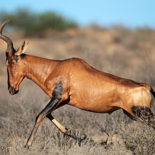 Wissenschaftlicher Name: Alcelaphus b caama Unterarten: Unterarten: Eine Unterart von Alcelaphus buselaphus (Kuhantilope). Verbreitung: Südafrika, Namibia, Botswana und Angola Lebensraum: Offenes Grasland und Savanne. Beschreibung: Mittelgroße Antilope mit ca. 180 Kilogramm Körpergewicht und einer Schulterhöhe von 1,20 bis 1,40 Meter. Grundfarbe helles Rotbraun. Die...