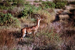 Wissenschaftlicher Name: Littocranius Walleri Unterarten: 2 Unterarten mit Verbreitung 1. Südliche Giraffengazelle (Littocranius w. walleri): Kenia, Uganda, Zentral-Tansania, 2. Nördliche Giraffengazelle (Littocranius w. sclateri): Somalia, Äthiopien. Lebensraum: Trockene Dornbusch-Landschaften mit Bäumen, sogar Wüsten. Beschreibung: Große Gazelle mit einem...