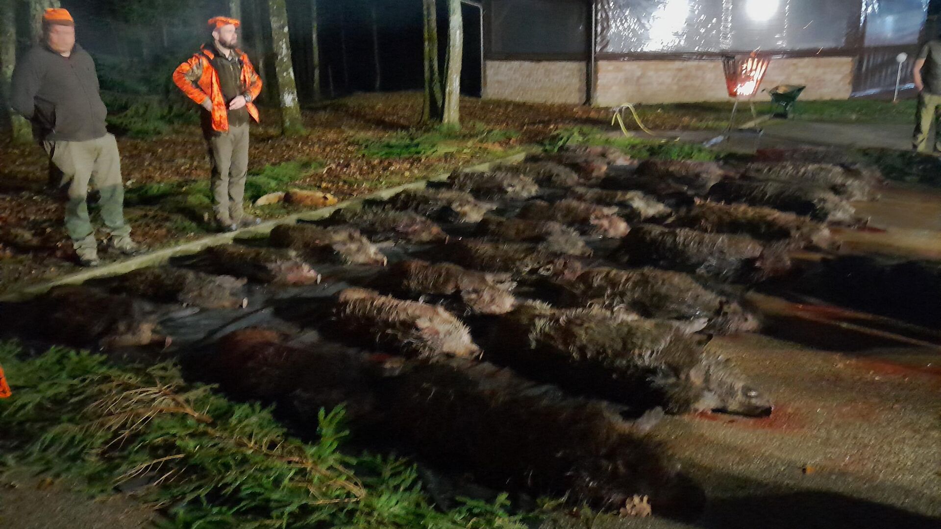 Beispiel: Die Gruppe erlegt 43 Schweine (9 + 22 + 12) in 3 Tagen, und der Totalpreis pro Jäger ist dann EUR 2.575,- einschl. Jagd/Unterkunft.