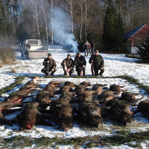 Normalerweise benötigt man für eine kleine Drückjagd 5-7 Schützen. Diese Jagd findet normalerweise vormittags statt, während nachmittags eine individuelle Ansitz- oder Pirschjagd stattfindet. Bei diese Kombinationsjagden werden oft sehr anständige Strecken erzielt, und es ist immer sehr angenehm, die Zeit in der Gesellschaft seiner Jagdfreunde zu verbringen.