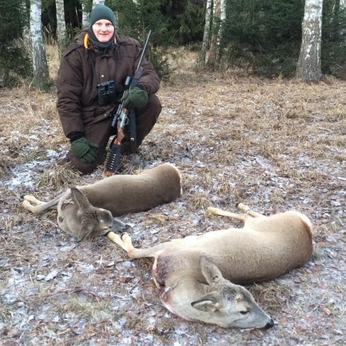 I followed the jumping roe through the scope. Just a few seconds before it reached the salvation of the hedge it made the fatal mistake that seems imbedded deeply in the genes of roe deer. It stopped to orientate. The firing pin fell instantly – and so did the deer. The distance was approximately 180 meters. I was more than satisfied. The first two shots at game with the new rifle had resulted in to fine roe does. They fell less than 20 seconds apart and yet at a distance between them of nearly half a kilometer.