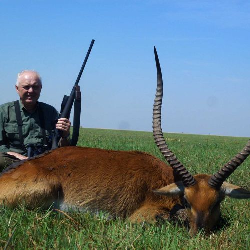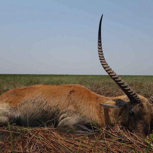 Kafue Lechwe - Die meisten dieser Safaris werden wie folgt durchgeführt: Unsere Jäger kommen am Nachmittag vor ihrer Jagd in Lusaka an. Unsere Mitarbeiter erwarten sie und bringen sie zum Hotel. Früh am nächsten Morgen holen sie unsere Berufsjäger und Tracker ab und fahren sie nach Lochinvar/The Kafue Flats (der einzige Ort auf dem afrikanischen Kontinent, um Kafue Lechwe zu jagen.) Es ist ein Jagderlebnis, das Sie nie vergessen werden, da Sie normalerweise Hunderte und Aberhunderte von Kafue Lechwe sehen. Bis zum Jagderfolg sind normalerweise mehrere Pirschen nötig, bis man eine Kafue Lechwe-Trophäe erbeuten kann. Ein Geschoss mit gestreckter Flugbahn erleichtert die Aufgabe. Nach Erlegung Ihrer Lechwe kehrt man am Nachmittag nach Lusaka zurück und setzt seine Afrikareise am nächsten Tag fort. Sehen Sie sich die Trophäenfotos oben an.