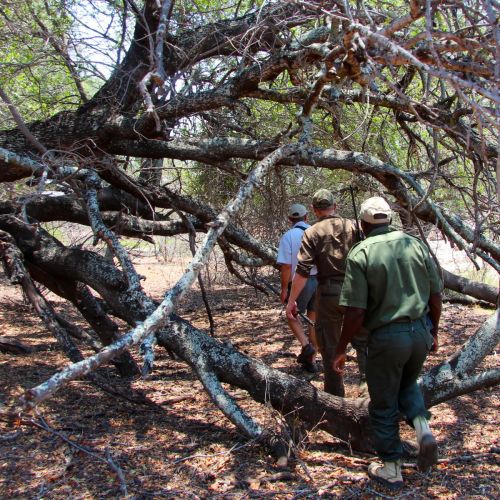 He just carried on and was soon at 200 meters distance. I fired a shot through the top of the trees against the dark silhouette. The bullet deflected and went high over the back of the animal. He was now trotting. Another shot – this time at well over 250 meters – failed to penetrate the Mopani bush. But the kudu was slowing down clearly affected by the first shot.