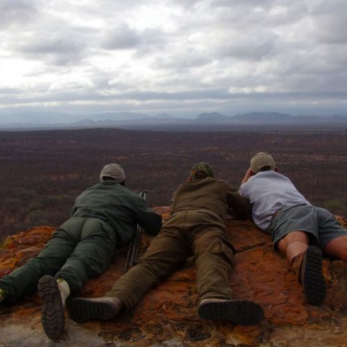 I crawled back to the car to get the Mauser. As silent as I could I sneaked a round into the chamber and made sure the rifle was not cocked. As fast as I could I crept back to Mias and Hassan who was still starring at the kudu bull below. I moved the last bit like a snake on the rocks and got in position between the others. I was lined up for a pretty easy shot from prone position with – literally – rock steady support.
