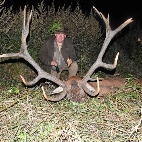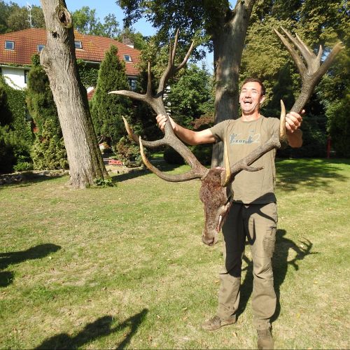 Nach Ankunft im Jagdhaus-Kubryk kann ich den Jagdaufseher Maciej sowie Jagdfreunde aus dem Münsterland begrüßen, Sie hatten bereits Jagderfolg. Schnell auspacken denn Maciej hatte es heute eilig und drängt zum Abendansitz. Wir fahren in ein Revierteil das ich kenne, habe jedoch hier noch nicht gejagd. Eine kleine Drückjagdkanzel bietet uns beiden gerade Platz, es wird eng. Ich sondiere erst mal das jagdliche Umfeld, eine Landwirtschaftliche Wildnis mit angrenzenden Buschwerk. Wir sind nicht zu früh vor Ort, denn nach kurzer Zeit gibt Maciej mir ein Zeichen, es kommt bereits Bewegung in den hohen Wildwuchs einer Brachfläche. Nur die Geweihspitzen verraten uns einen ziehenden Hirsch. Auf einen anschließenden Wiesenstreifen, ca. 350 Meter entfernt, steht er nun völlig frei und meldet. Wir können den Hirsch jetzt gut ansprechen, ein starker reifer Hirsch mit mächtiger Auslage hält hier sein Rudel zusammen. Das ständige hin und her mit einigen Tieren ließ den Hirsch nicht näher kommen, für eine saubere Kugel steht der Hirsch einfach zu weit entfernt. Dann geht alles sehr schnell, Hirsch und Tiere ziehen in das undurchsichtige, zwei Meter hohe Unkraut und sind jetzt in ständiger Bewegung, der Hirsch treibt die Tiere immer wieder zusammen. Wir sehen nur noch die oberen Enden des Geweihs. Ich bin seit geraumer Zeit im Anschlag und warte das der Hirsch sich frei stellt. Ständig röhrend wechselt er den Standort und treibt seine Tiere durch die verwilderte Fläche. Plötzlich, auf ca. 175 Meter steht er in einer kleinen Unkrautblöße halbwegs frei, Schuß und aufsteigen des Hirsches sind eins, er zeichnet gut und ist nach 50 Meter im Unkraut verschwunden. Unser kleiner Ansitzplatz wackelt etwas, auch Maciej hat das Jagdfieber gepackt. Nach kurzer angespannter Wartezeit verlassen wir unseren Platz und suchen in der Unkrautwildnis den Hirsch, es ist schwierig, aber dann doch erfolgreich. Nun stehen wir vor dem Gestreckten, ein Hirsch mit einer Auslage und Stärke wie ein Wapiti ! Maciej und ich sind von der stärke des Hirsches überwältigt, staunen und begutachten einen alten, starken Erntehirsch. Jetzt gönnen wir uns etwas Ruhe, ich zünde meine Zigarre und bleibe bei dem Hirsch, Maciej holt für die Bergung Hilfe. Allein gelassen in den tiefen des polnischen Landes, mit einem verstummten Rothirsch, wird es langsam dunkel. Es ist ein herrlicher Abend, in der Wildnis ziehen geräuschvoll Sauen an mir vorbei und ein Schoof Enten streicht zu den benachbarten Teichen . Nach