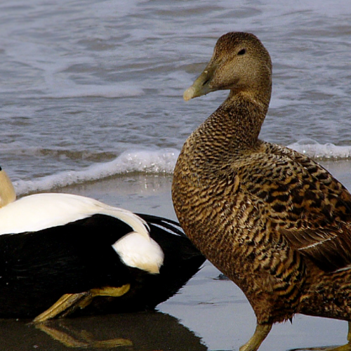 Beschreibung: Eiderenten sind große Meeresvögel mit einem charakteristischen äußeren Flaum, bekannt als Daunenkleid, den sie nutzen, um sich vor Kälte zu isolieren. Das Männchen hat ein schwarz-weißes Gefieder, während das Weibchen ein gedämpfteres braunliches Gefieder hat.