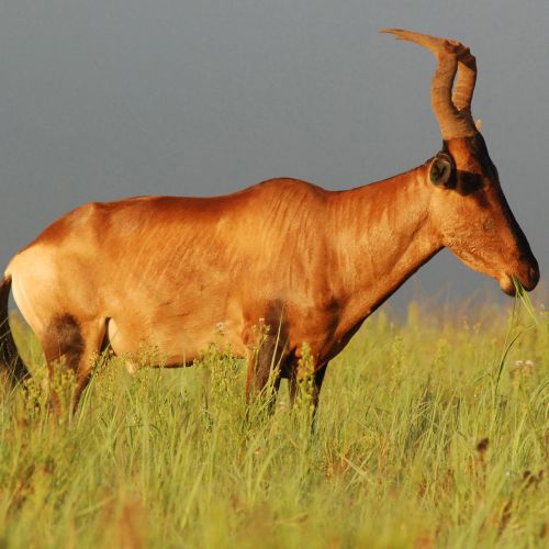 Beschreibung: Mittelgroße Antilope mit ca. 180 Kilogramm Körpergewicht und einer Schulterhöhe von 1,20 bis 1,40 Meter. Grundfarbe helles Rotbraun. Die Hörner sind dunkel und schwer, mit starken Querwülsten, V-förmig gestellt, erst nach vorn und seitwärts verlaufend, dann scharf nach hinten abknickend.