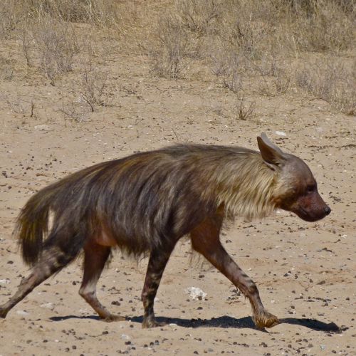 Beschreibung: Große Hyäne mit einem Gewicht bis 57 Kilogramm und einer Schulterhöhe bis 80 Zentimeter. Kurzer Fang, lange, zugespitzte Gehöre, deutlich abfallender Rücken, Decke sehr zottig und rauh, fast einfarben dunkel schwärzlichbraun, auf Nacken, Schultern und Vorderrrücken Mähne aus langen, hellen, gelbbraunen Haaren. Undeutlich gestreift, deutlicher an den Läufen. Schwanz buschig, ziemlich lang und dunkel.