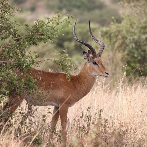 Beschreibung: Die spezielle Beschreibung der drei Unterarten kann bis auf wenige Merkmale vernachlässigt: Der Angola-Impala hat schwarze Streifen im Gesicht, der Ostafrikanische Impala besitzt die stärkste Trophäe und den größten Körperbau. Generell handelt es sich um eine mittelgroße Antilope mit rund 70 Kilogramm Körpergewicht und einer Schulterhöhe bis zu einem Meter. Grundfärbung ist ein leuchtendes gelblich-rotbraun, an den Flanken heller. Über den Augen findet sich ein weißer Streifen. Die Unterseite ist weiß. Die Hörner sind lang und in S-Form lyraartig zueinander-stehend, an den Enden nach hinten auseinanderschwingend.