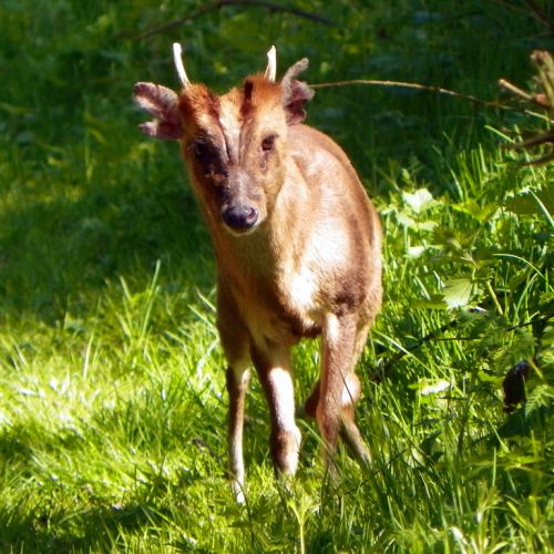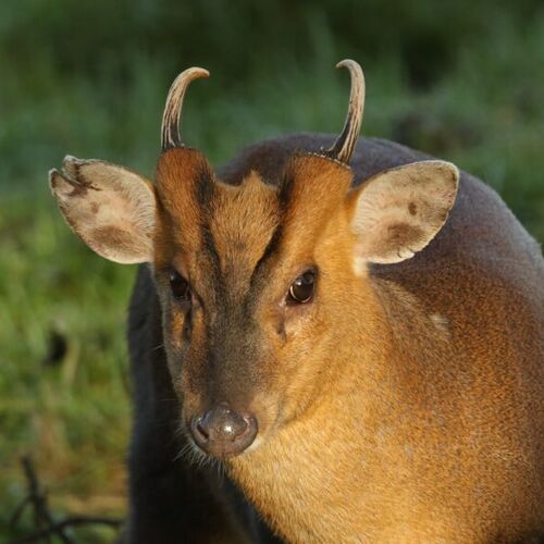 Beschreibung: Kleiner Hirsch mit ca. 12 Kilogramm Gewicht, einer Schulterhöhe von maximal 46 Zentimetern und einer Körperlänge bis 85 Zentimeter ohne Wedel. Grundfarbe der Decke im Sommer rotbraun, im Winter graubraun.. Der Muntjak besitzt von den hohen Rosenstöcken herablaufende schwarze Streifen, die sich in Augenhöhe vereinigen um als breiterer Streifen bis zum nasenschwamm zu verlaufen. Das Geweih ist außerordentlich kurz. Bei den Hirschen sind die Eckzähne des Oberkiefers stark verlängert und ragen hauerartig seitlich aus dem Äser.