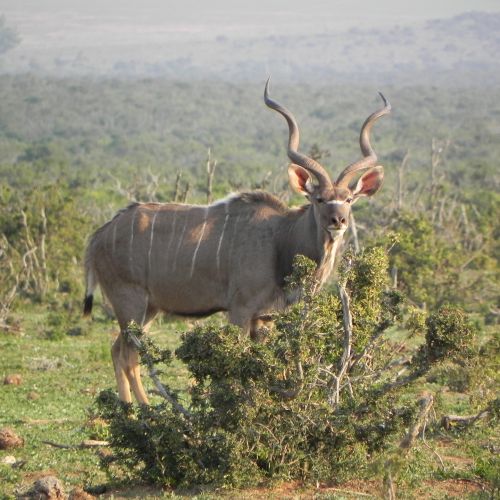 Beschreibung: Groß, elegant mit schmalem Körper und langen Beinen. Das Fell ist graubraun bis rötlichbraun mit 4-12 weißen vertikalen Streifen, die an ihren Flanken herunter laufen. Der Ostkap-Kudu hat ein viel dunkleres Fell als die anderen Unterarten. Die Bullen sind größer als die Weibchen und tragen eindrucksvolle, spiralförmige Hörner. Sie können eine Schulterhöhe bis zu 160 cm erreichen und zwischen 190-270 kg wiegen. Die Kühe sind hornlos, erreichen eine Schulterhöhe von ca.100 cm und wiegen 120-210 kg.