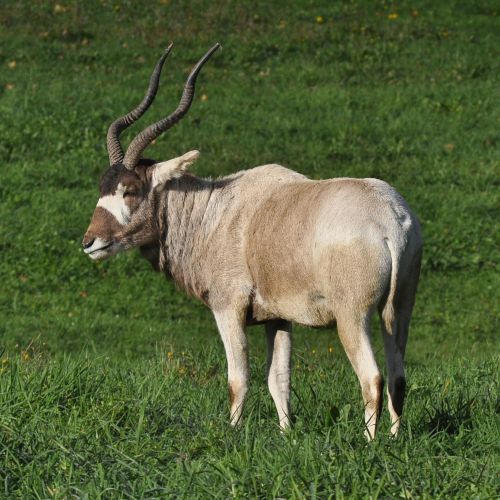 Beschreibung: Große Antilope (100-125 kg) mit spektakulären dunklen Hörnern, die korkenzieherartig gewunden sind. Weißgrau mit schwarzen und braunen Zeichnungen am Kopf.