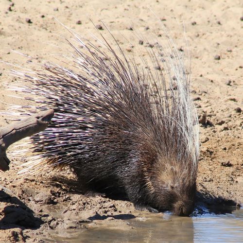 Beschreibung: Das größte Nagetier der Region mit charakteristisch langen (bis 50 cm), rückwärts gerichteten Stacheln. In der Regel braun mit langen weißen Borsten, die vom Kopf nach hinten wachsen. Körperlänge 65-85 cm, Gewicht 18-30 kg. Die weiblichen Stücke sind im Durchschnitt größer.