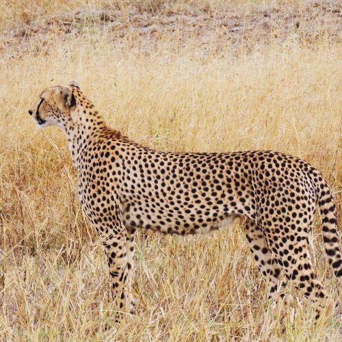 Beschreibung: Der "Windhund" unter den Katzen mit sehr schlanker Gestalt und sehr langen Läufen. Erinnert an einen sehr hohen, schlanken Leoparden. Gewicht 40 bis 70 Kilogramm, Schulterhöhe ca. 70 Zentimeter. Gelbbraun bis hellgelblich mit kleinen runden, schwarzen Flecken besetzt. Bauch heller, fast weiß, weniger stark gefleckt. Gehöre kurz. Von den Lichtern zum Fang charakteristischer schwarzer Streifen. Langer Schwanz, größtenteils ebenfalls gefleckt. Der Gepard erreicht eine Spitzengeschwindigkeit von 120 km/h, das allerdings nur sehr kurzfristig. Er ist damit wohl das schnellste Raubwild der Welt. Der Gepard läßt den Rest seiner Beute liegen und kehrt selten zu ihr zurück. Im mittleren Osten wurden Geparden gezähmt und für die Jagd auf Gazellen abgerichtet.