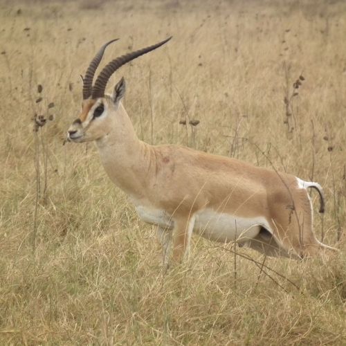 Beschreibung: Mittelgroße Gazelle mit einer Schulterhöhe von 95 Zentimetern und einem Gewicht von 60 bis 85 Kilogramm. Färbung gelbbraun, nur sehr unauffälliger Flankenstreifen, schwärzlicher Nasenfleck, rötlichbraune Stirn und nasenrücken, weißer Überaugenstreifen. Hörner lang, an der Basis stark, stark gerippt, schwach S-förmig, verschieden bei den jeweiligen Unterarten.