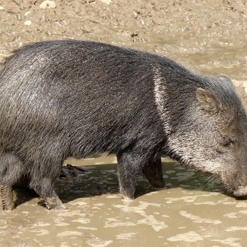 Beschreibung: Neuweltschwein bis 25 Kilogramm Körpergewicht, Länge bis 1 Meter ohne Bürzel (5 cm), Schulterhöhe bis 50 Zentimeter. Dunkel- bis schwarzbraune Schwarte mit halsbandähnlicher weißlicher Zeichnung vom Widerrist schräg nach vorn unten zur Kehle, weißliche Zeichnung auch auf den Wangen. Kopf- und vordere Rückenborsten länger. Stärker entwickelte Eckzähne, aber geringer als beim europäischen Wildschwein.