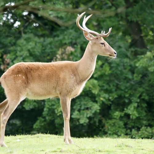 Beschreibung: Doppelt rehgroßer Hirsch mit fast einfarbiger brauner Decke. Körpergewicht bis 50 Kilogramm, Körperlänge bis 1,50 Meter ohne Wedel (25 cm), Schulterhöhe bis 80 Zentimeter.