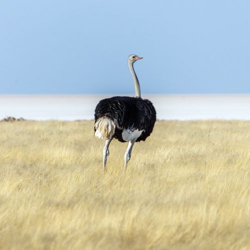Beschreibung: Der größte lebende Vogel, flugunfähig, unverwechselbar, langer Hals und lange Beine, kleiner Kopf, alle ohne Federn. 2-2,8 m groß. Männchen haben ein schwarzweißes Gefieder, die Weibchen ein graubraunes.