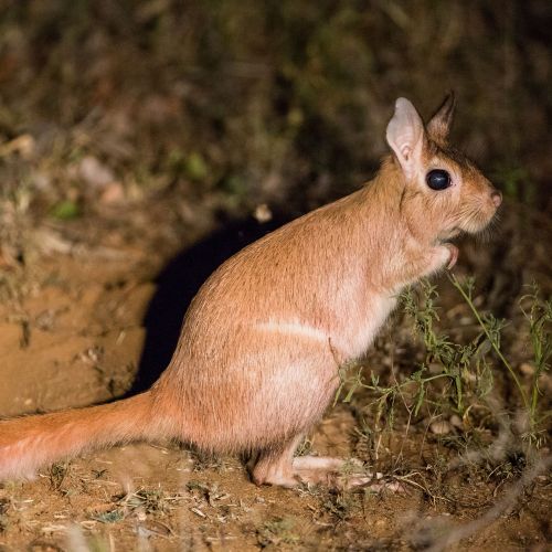 Beschreibung: Großes Nagetier, ähnlich einem Känguru. Die Farbe kann von rotbraun bis hellgrau variieren, der Schwanz hat eine schwarze Spitze. Körperlänge 36-45 cm plus einem langen Schwanz von 36-47 cm Länge.