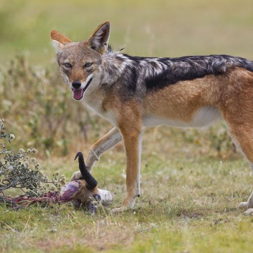Beschreibung: Leuchtend gefärbter Schakal mit fuchsähnlichem Habitus. Schulterhöhe 40 Zentimeter, Gewicht bis 14 Kilogramm. Zugespitzte, sich zur Basis hin verbreiternde Gehöre, Kopf gräulich, Rücken mit breiter, dunkler Schabrackenzeichnung, scharf gegen rötlichbraune Flanken und Läufe abgegrenzt. Schabracke nach hinten weiß getüpfelt, aus der Distanz silbrig erscheinend.