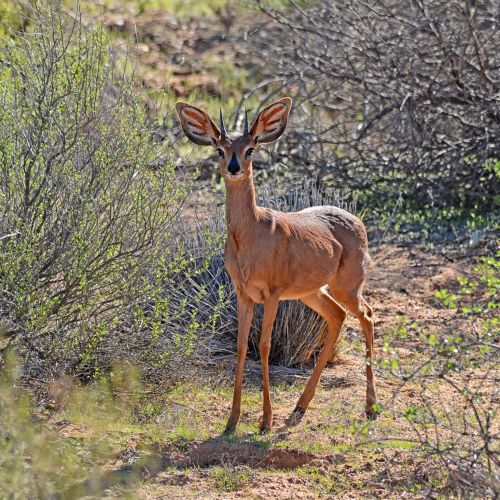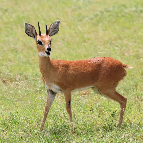 Beschreibung: Kleine Antilope mit maximal 15 Kilogramm Gewicht und einer Schulterhöhe von höchstens 60 Zentimetern. Rötlich gelbbraun gefärbt, manchmal gräulich. Heller bis weißer Augenring, schwärzlicher Nasenfleck. Hörner gerade, spitz und glatt, leicht nach vorn gebogen.