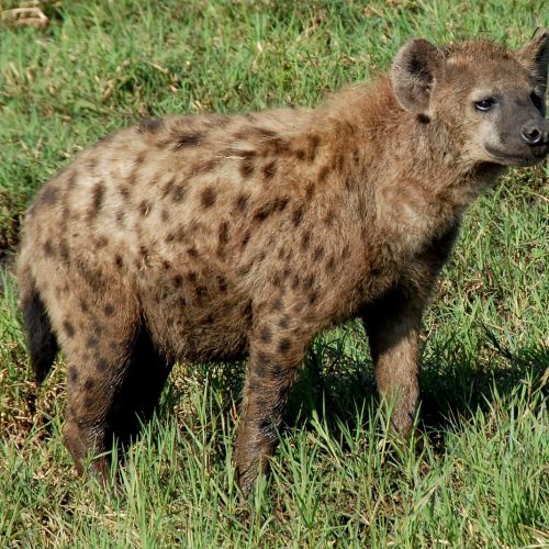 Beschreibung: Große, kräftig gebaute Hyäne mit abfallendem Rücken, Körpergewicht bis 80 Kilogramm, Schulterhöhe bis 90 Zentimeter. Schädel breit, Fang kurz, große Seher, kurze abgerundete Gehöre, Decke kurz, Grundfarbe sehr variabel von gelblich bis dunkelgrau. Der ganze Körper unregelmäßig mit schwärzlichen runden Flecken bedeckt. Gesicht, Fang und der untere Teil der Läufe dunkelbraun. Kehle heller, ungefleckt. Kurze Nacken- und Schultermähne. Schwanz ziemlich kurz mit buschigem, schwarzen Ende.