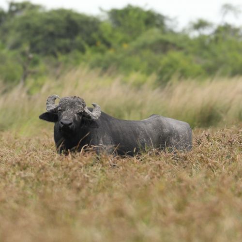 Beschreibung: Großes, in vielen Gegenden domestiziertes Wildrind mit weitausladenden, nach hinten gebogenen Hörnern. Körpergewicht bis 900 Kilogramm bei einer Schulterhöhe von maximal 1,80 Meter und einer Körperlänge ohne Schwanz (1,00 Meter) von 3 Metern. Deckenfarbe graubraun, oft von Schlamm bedeckt.