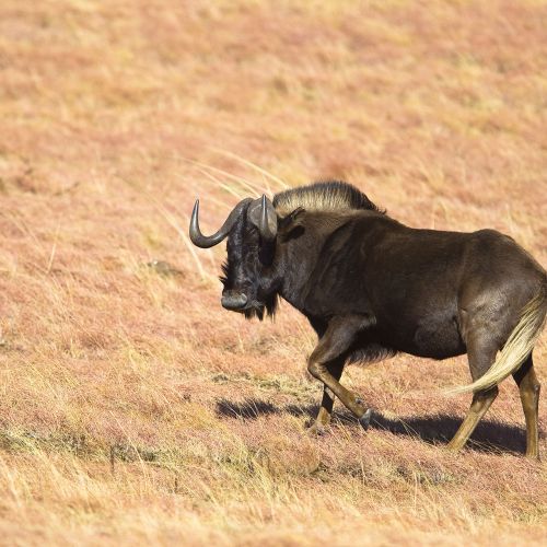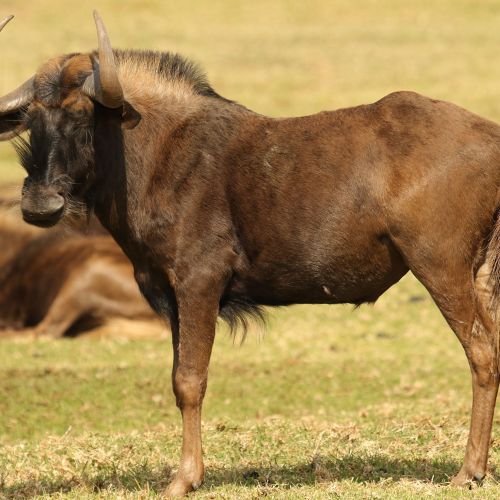 Beschreibung: Mittlere Antilope aus der Gnu-Familie mit einem Gewicht von 150 bis 170 Kilogramm und einer Schulterhöhe von 120 Zentimetern. Grundfarbe dunklbraun bis braunschwarz, reinweißer Schwanz. Charakteristisch für das Weißschwanzgnu ist ein Büschel nach oben gerichteter Haare am Kopf und eine gutausgebilde Mähne, die häufig das Tier höher erscheinen läßt.